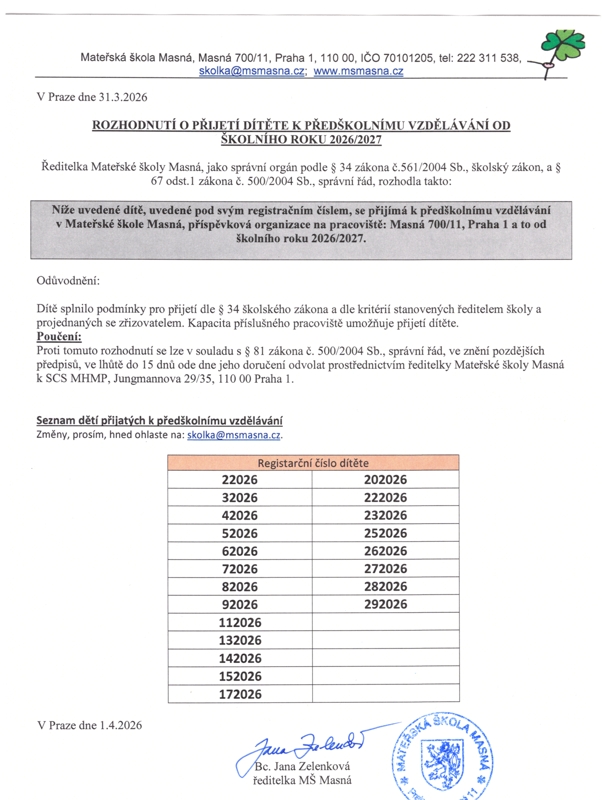Rozhodnutí o přijetí dětí k předškolnímu vzdělávání do MŠ Masná od školního roku 2026/2027
